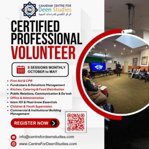 Canadian Centre for Deen Studies is excited to announce the launch of a groundbreaking Certification Program for Professional Volunteers – a first-of-its-kind initiative designed to elevate the role of volunteers in building vibrant Muslim communities. This program features a series of eight (8) in depth workshops where participants will receive specialized training.