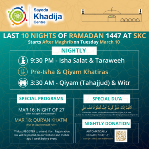 Last 10 Nights Ramadan 1447 2026-03-09 No Comments Last 10 Nights Ramadan 1447 at SKC begin on Tuesday March 10 after Maghrib iA